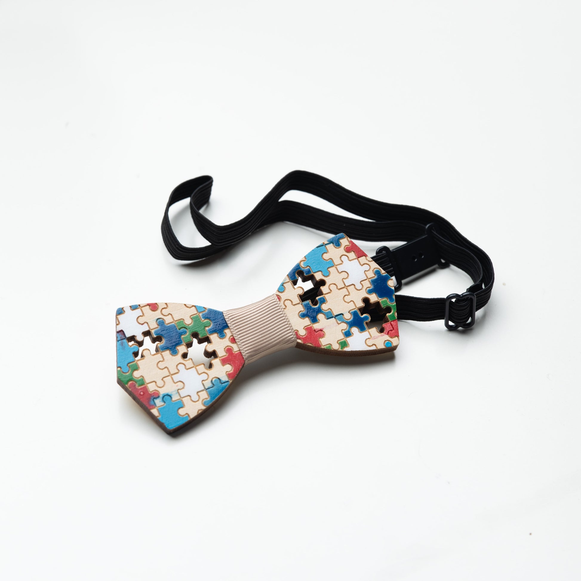 Puzzle est un nœud papillon original en bois, décoré d’un motif pièces de puzzle multicolores.